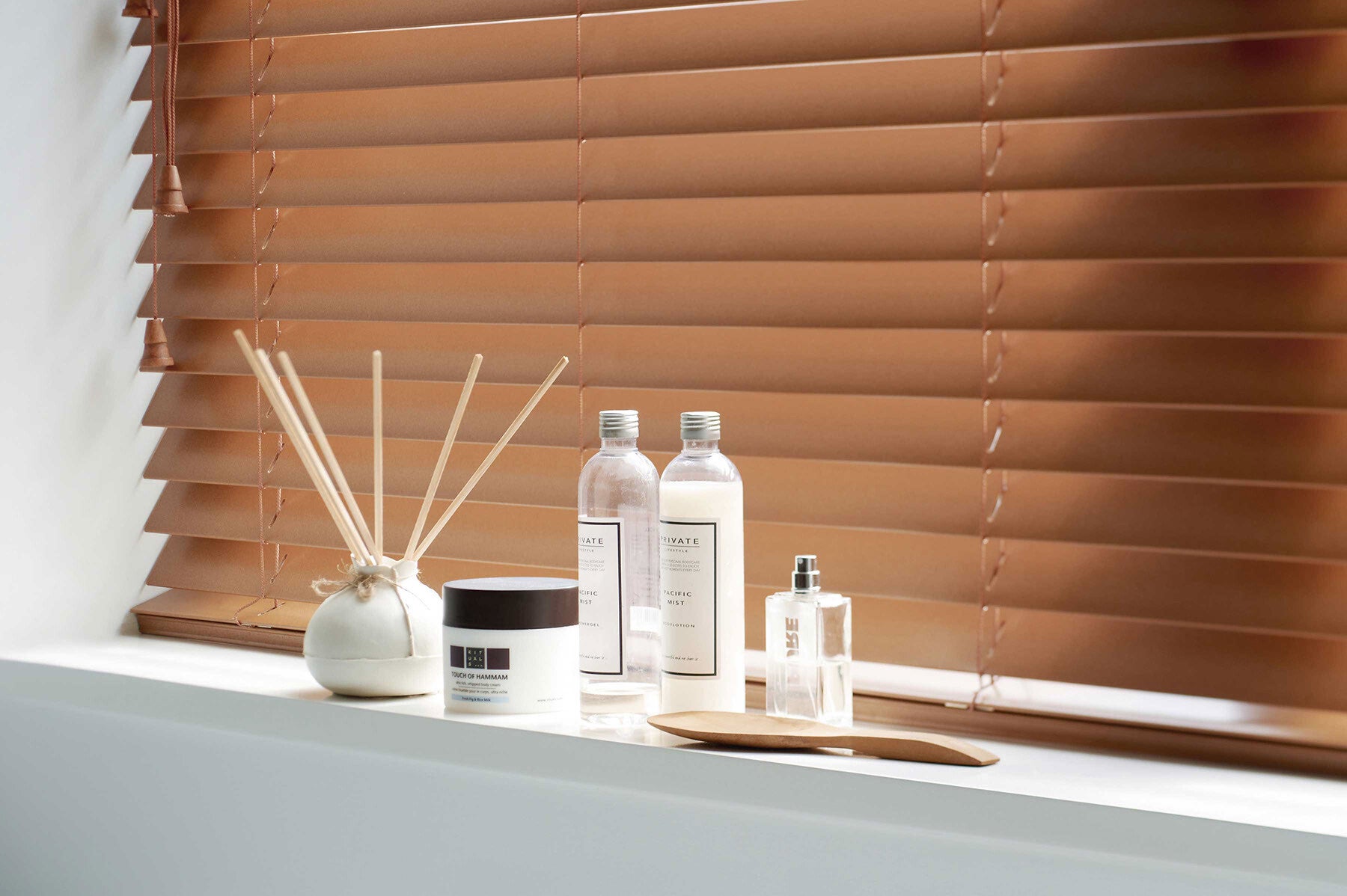 De lamellen in de houten jaloeziecollectie vanzijn verkrijgbaar in de breedtes 25, 35, 50 en 70 mm.